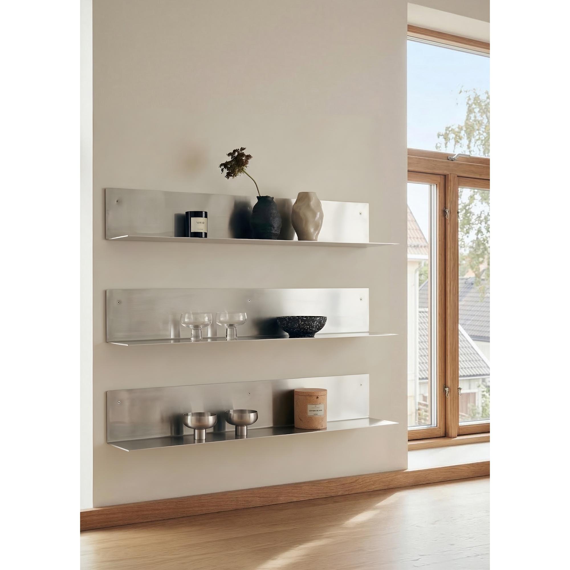 Het rek dient zowel als praktische opbergruimte als visueel element, waar boeken, porselein of kleinere objecten een plekje kunnen vinden. Het rek past moeiteloos in elke ruimte, van de keuken en badkamer tot de hal en woonkamer, waar het een modernere en strakkere uitstraling geeft. Tegelijkertijd zorgt het roestvrijstalen oppervlak voor een duurzame en onderhoudsvriendelijke afwerking, waardoor het geschikt is voor dagelijks gebruik. Verkrijgbaar in drie verschillende maten.