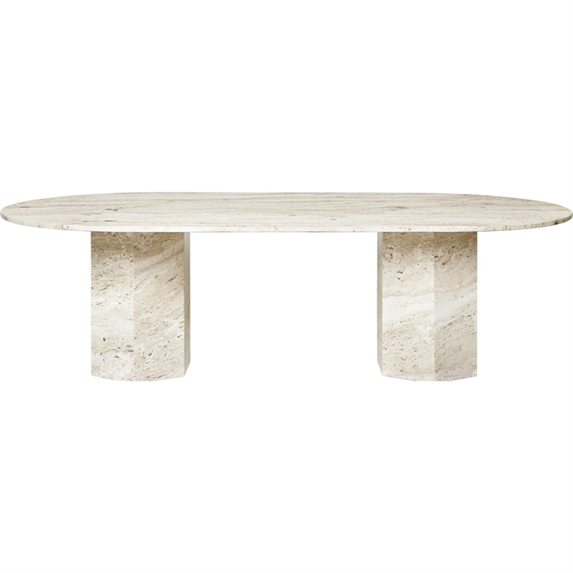 De Epic eettafel van Gubi is gemaakt van massief natuursteen en kenmerkt zich door het elliptische tafelblad en de zware, monolithische structuur. Het witte travertijn vertoont open poriën, fossiele afdrukken en natuurlijke nerfpatronen, die per tafel verschillen en elk exemplaar uniek maken. De steen is geselecteerd op basis van zijn bijzondere structurele eigenschappen en bewerkt met respect voor de oorsprong, het gewicht en het oppervlak van het materiaal, wat de tafel een onderscheidend en compromisloos karakter geeft. De Epic-serie is gebaseerd op klassieke architectonische referenties en werkt met pure geometrische vormen in massieve materialen, waarbij proporties en gewicht een geplaatst onderdeel van de expressie vormen. De eettafel maakt deel uit van de Epic-collectie en is door Gubi als een op zichzelf staand object van natuursteen geproduceerd.