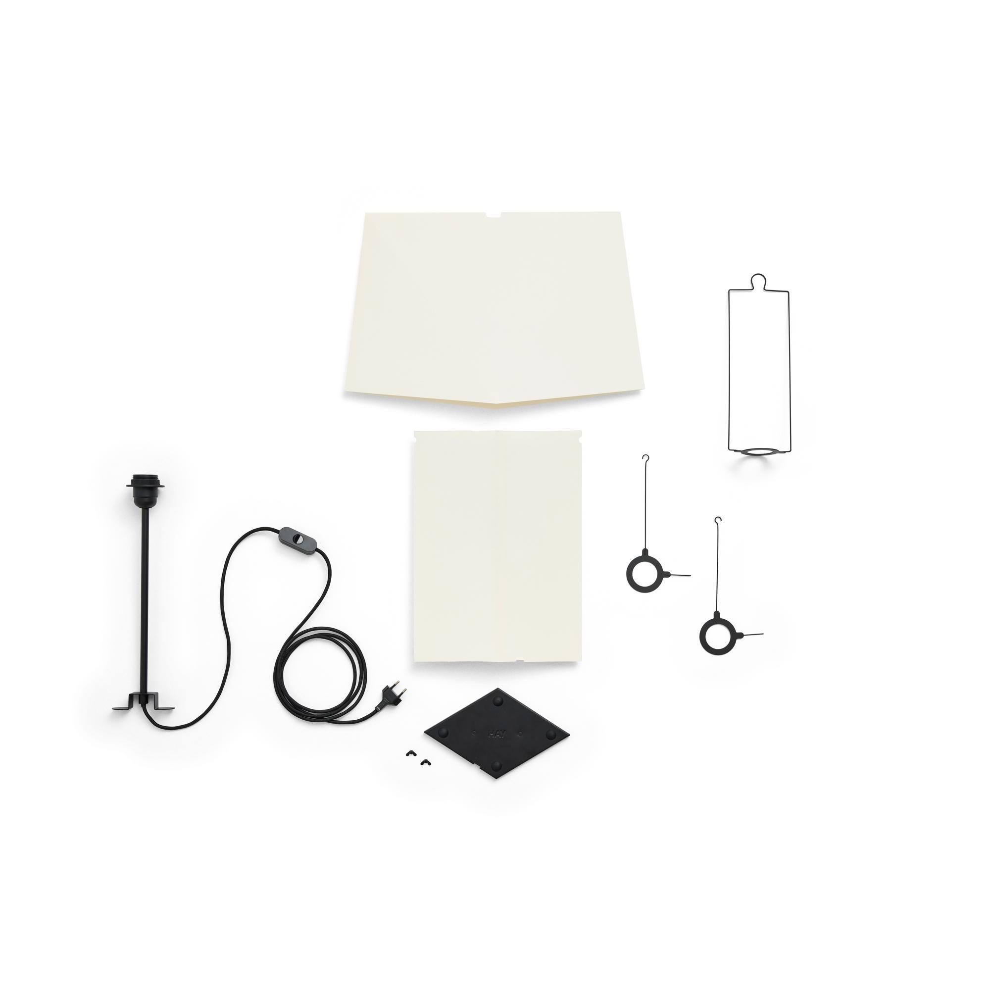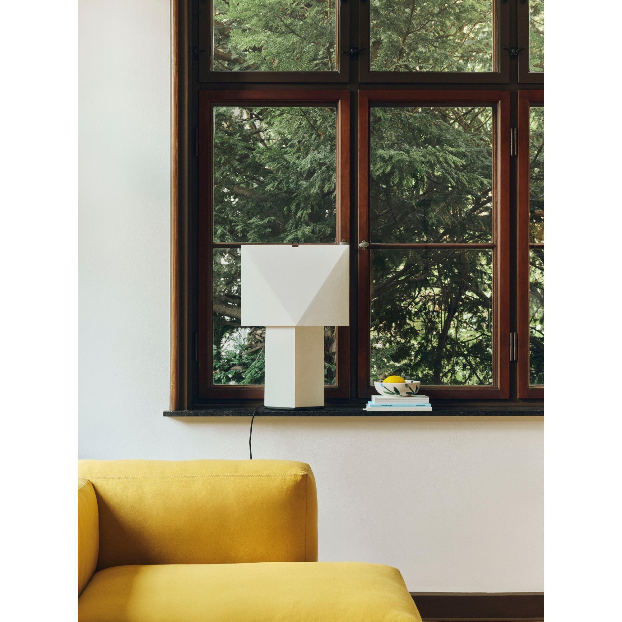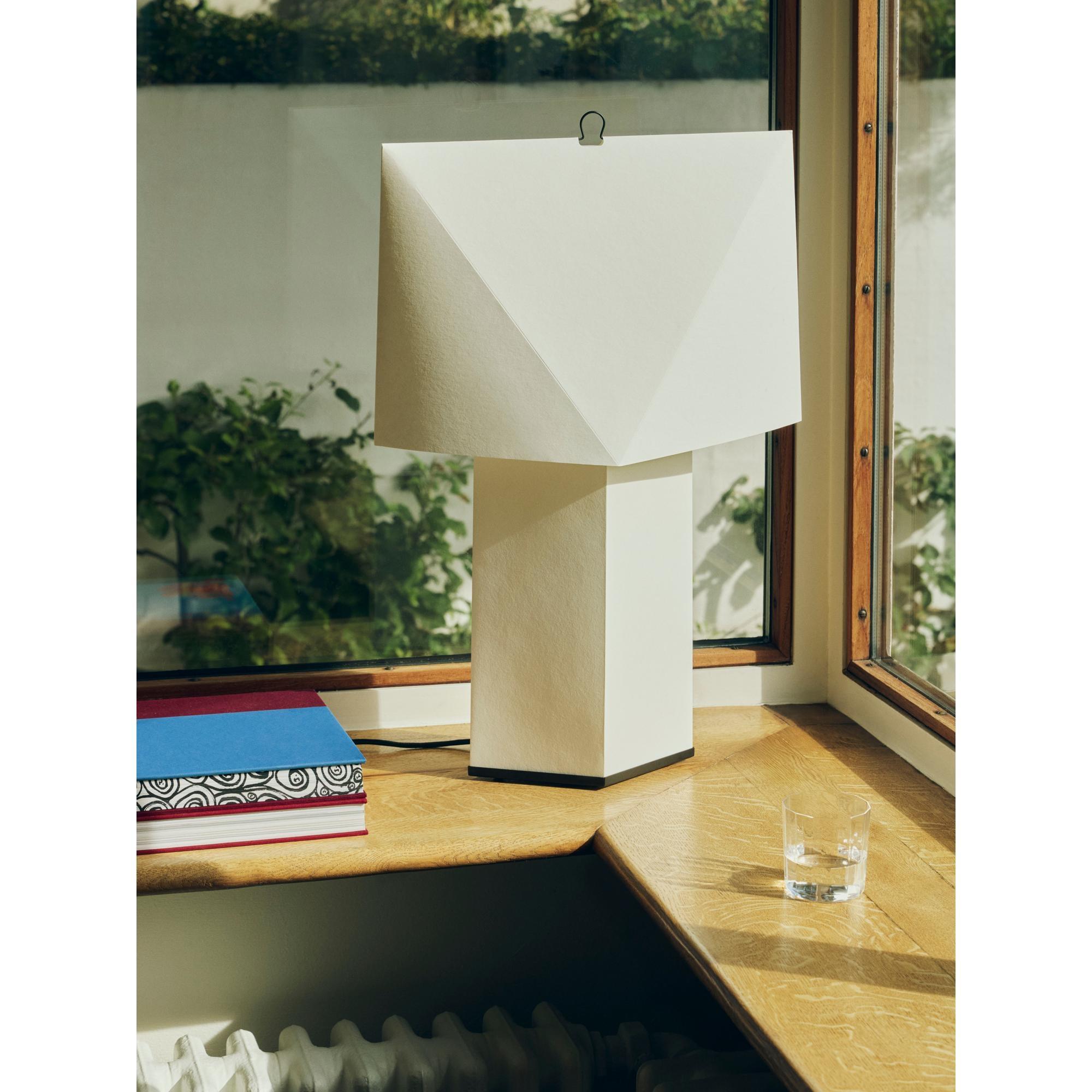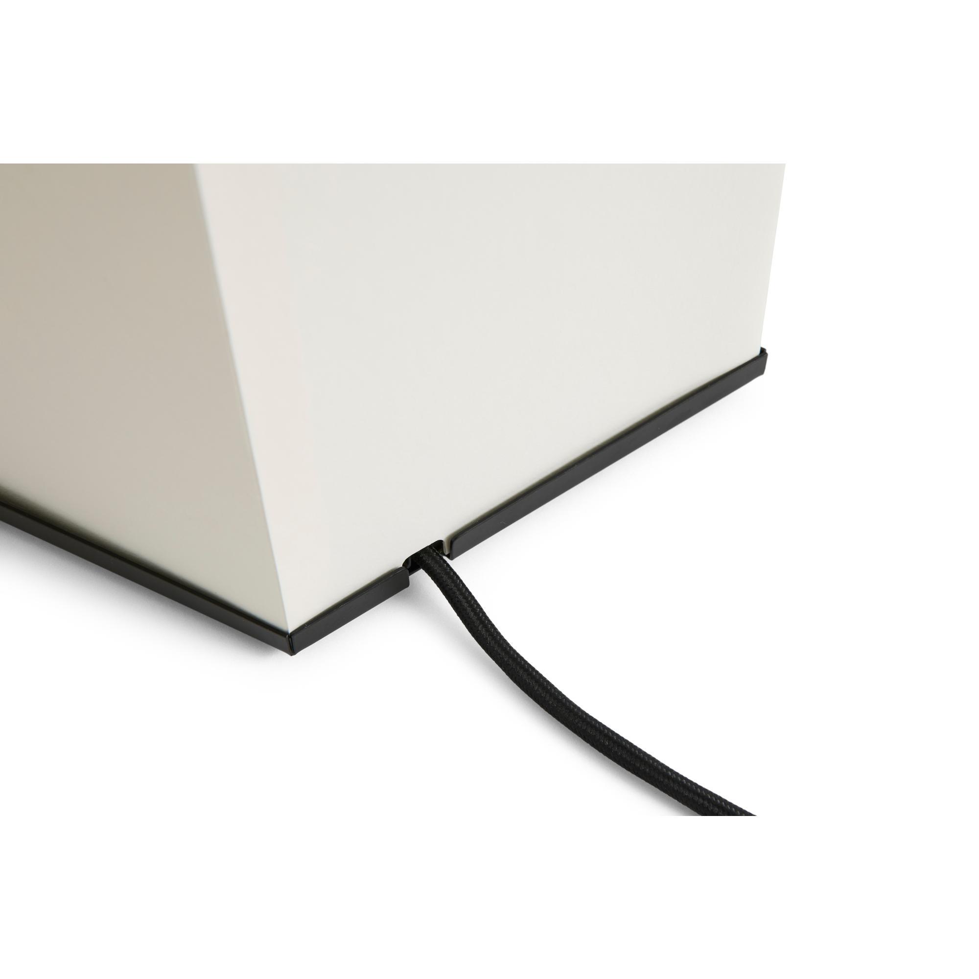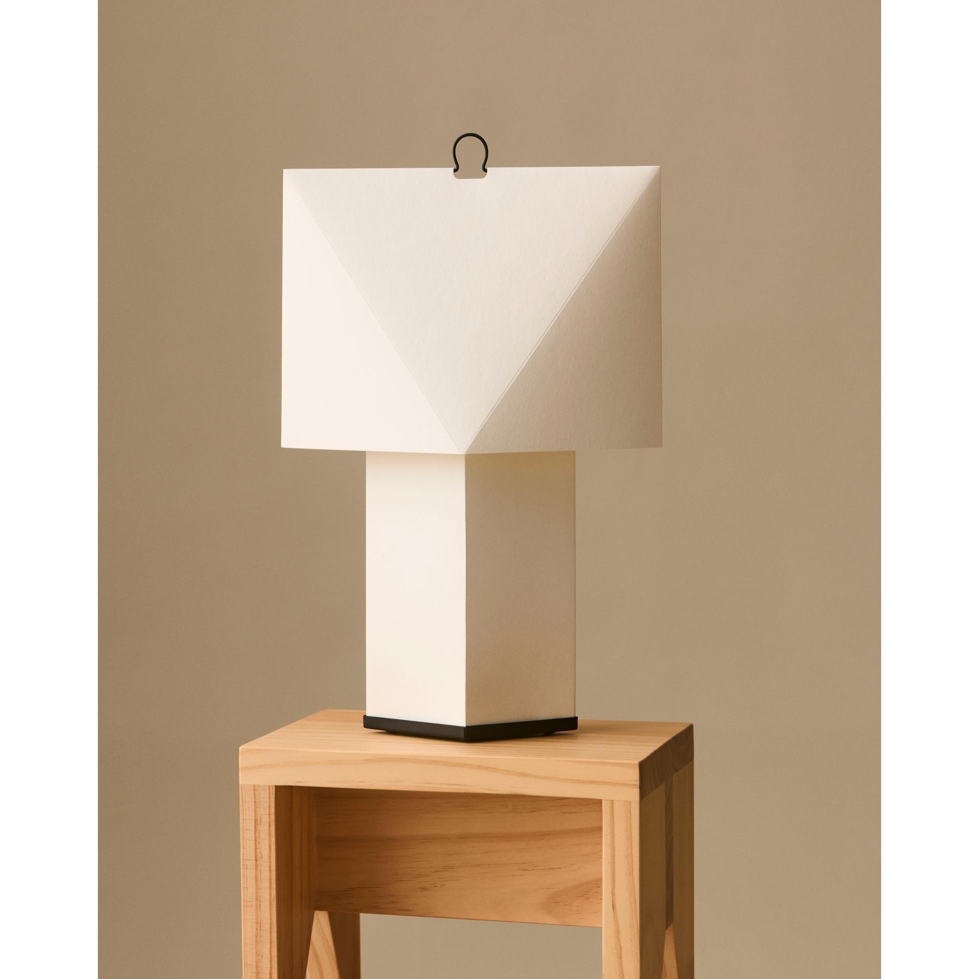 De Aplat tafellamp, ontworpen door het Franse designduo CPRV, is een lichtgewicht en sculpturale lamp, voornamelijk gemaakt van gevouwen papier. De lamp wordt plat verpakt geleverd en moet door de gebruiker zelf in elkaar worden gezet. Scherpe lijnen en precieze hoeken creëren volume en geven de vorm een eenvoudige, grafische uitstraling. Het diffuse papieren oppervlak schijnt een zacht en sfeervol licht dat doet denken aan kaarsen en warmte en sfeer aan de ruimte toevoegt. De minimalistische constructie in combinatie met een discrete metalen haak maakt de lamp licht en gemakkelijk te verplaatsen. Verkrijgbaar in twee maten en past perfect in de meeste ruimtes – op tafels, planken en vensterbanken of als vloerlamp.