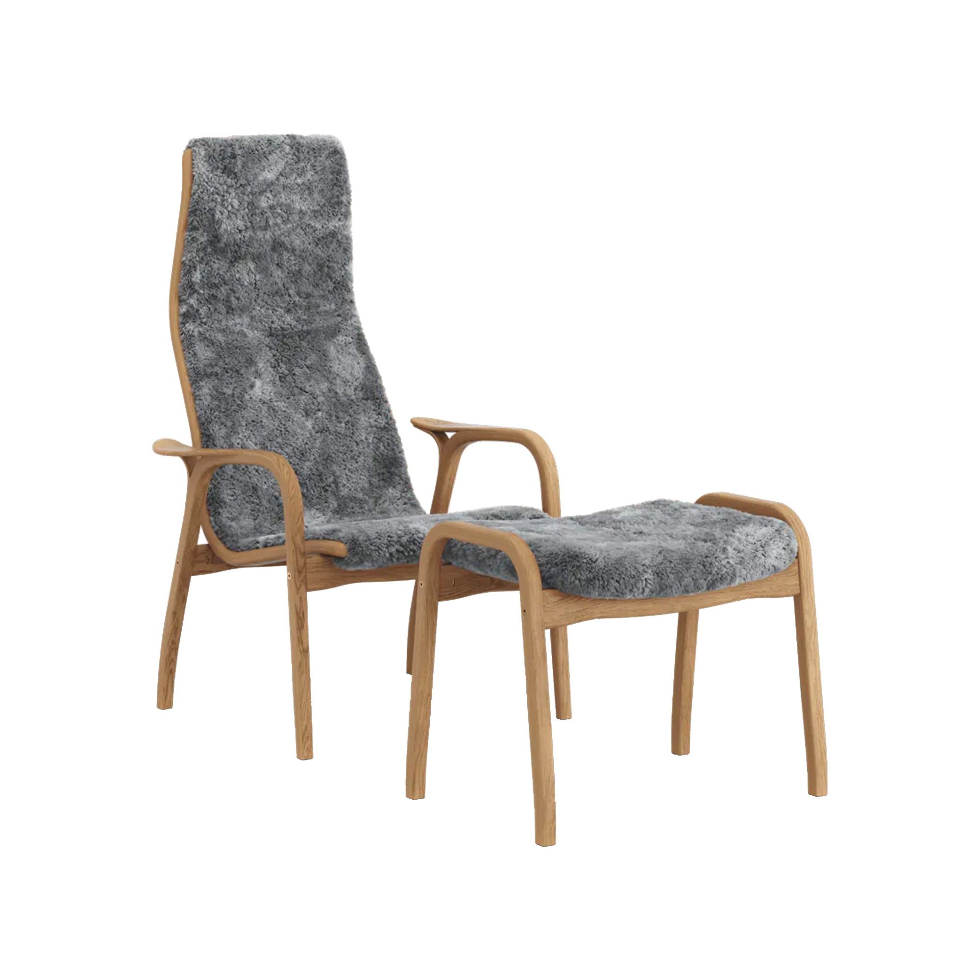 Swedese Lamino Fauteuil met Voetenbankje, Hoog Geolied eiken/Scandinavisch Grijs/schapenvacht